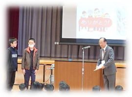 12月3日、朝上小学校で赤い羽根共同募金贈呈式が行われました。